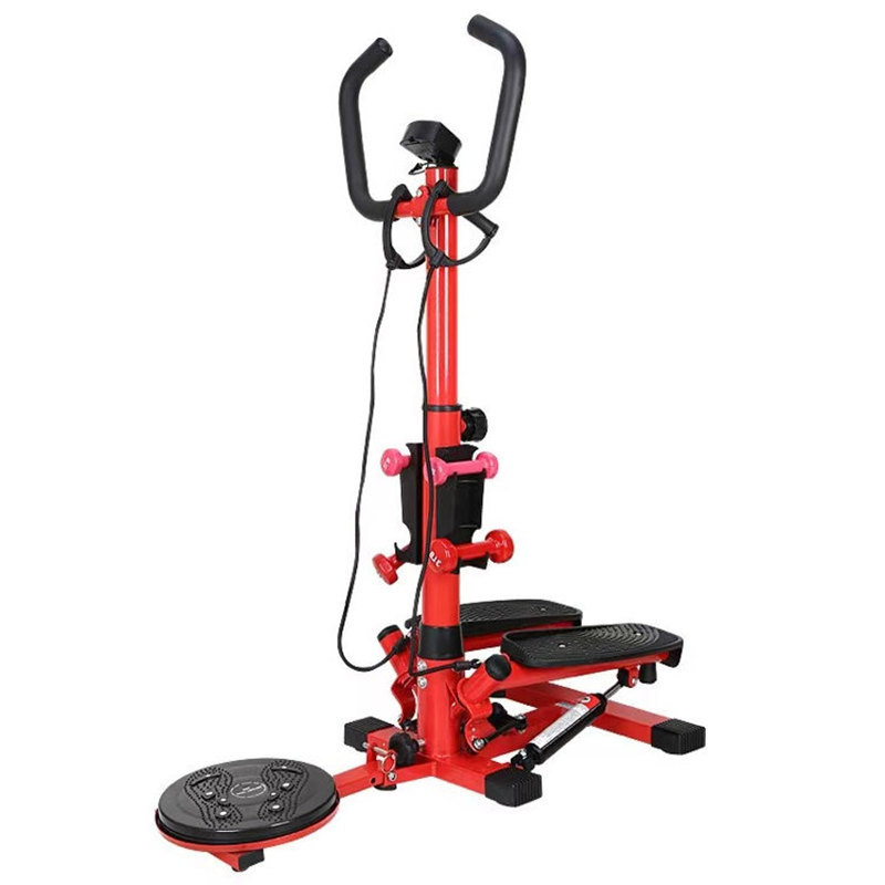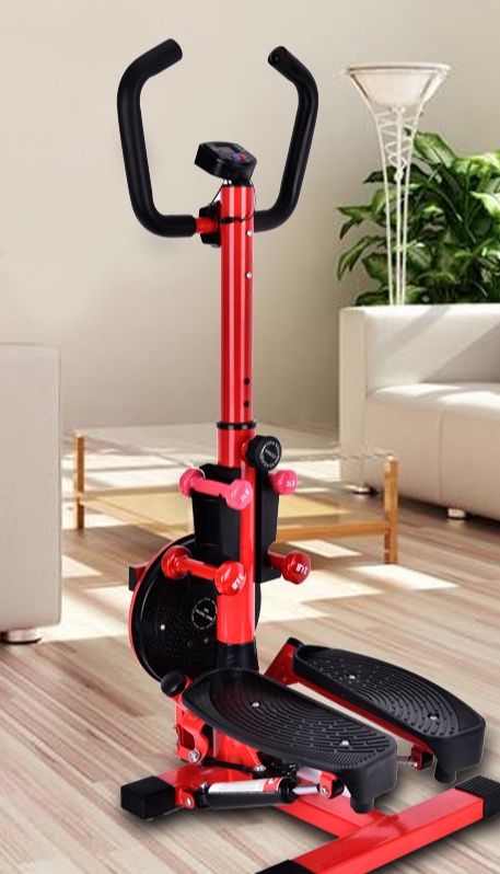 自宅で手軽に有酸素運動ができるステッパーです。 足踏み運動に加えてツイスト機能を搭載し、下半身とウエスト周りを同時に鍛えられます。 高さ調整可能なハンドルバーと運動量を表示するデジタルカウンター付きで、効率的なトレーニングをサポートします。 ゴムバンドも付属しており、上半身の筋力強化も可能です。 コンパクトな設計で省スペースに収納でき、毎日の健康維持に最適な運動器具です。